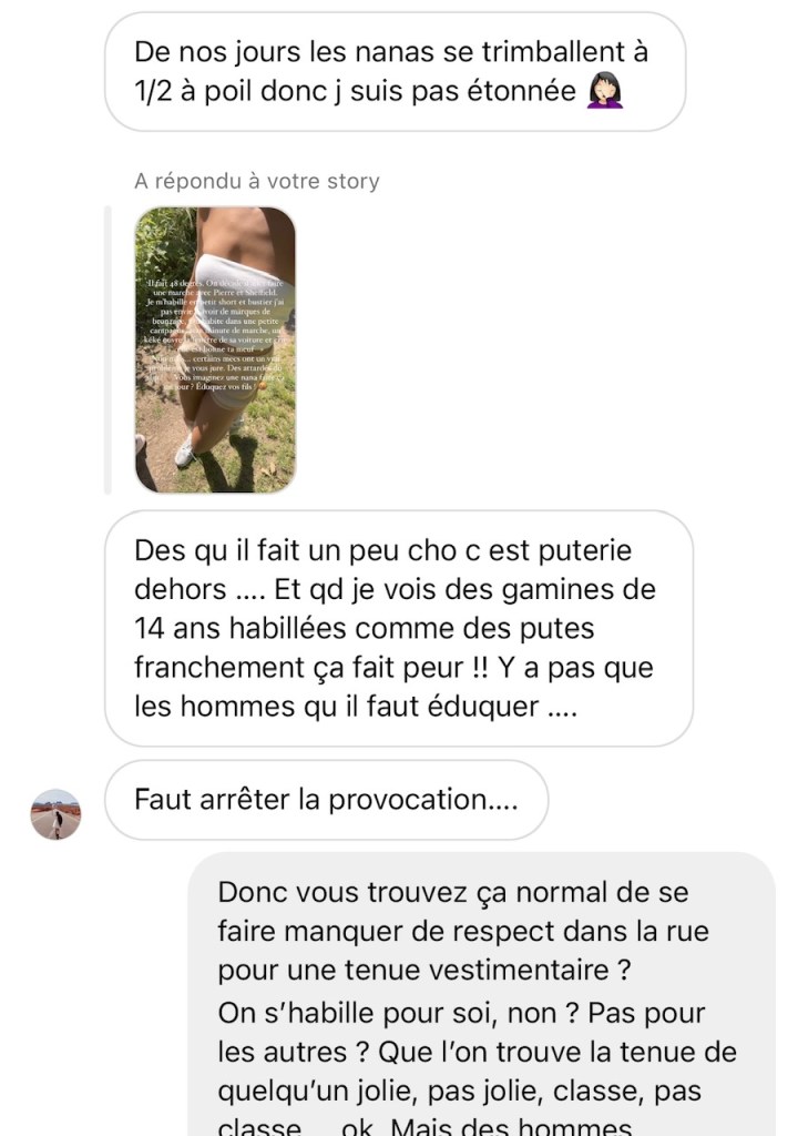 J’aimerais lui répondre, mais je n’en n’ai pas la force. Je n’ai pas la force de la contredire, et pourtant, c’est atroce. Comment laisser passer ces propos venant d’une femme, d’une soeur, d’une épouse ou peut-être même d’une mère. Qu’importe le titre, finalement, j’espère juste qu’elle finira par se taire. Je n’ai pas la force de me battre contre celle qui m’offre cette solution facile. Celle qui me conseille de changer de pays, plutôt que de continuer à militer, pour vivre tranquille . C’est en réfléchissant de la sorte, qu’elle donne raison à ces porcs imbéciles.