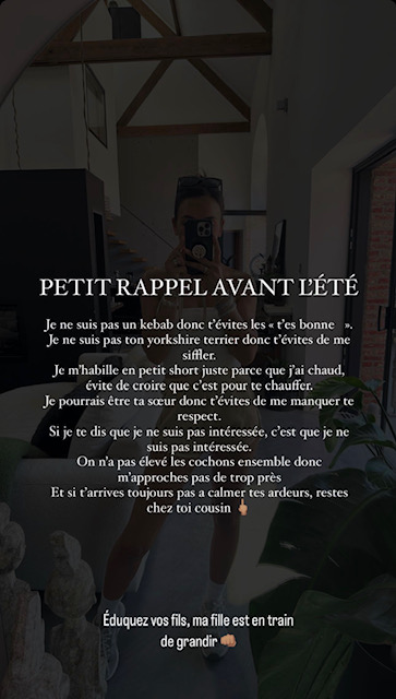 J’aimerais lui faire croire qu’on ne lui manquera jamais de respect. Qu’elle sortira tard le soir sans se soucier du danger. Qu’elle portera cette jolie robe d’été sans un instant se méfier. Mais il y a la réalité. Celle qui t’éclate à la gueule, comme chaque été et te rappelle à quel point rien n’aura changé. A quel point certains hommes vont continuer. ‘ T’es bonne ‘, ‘ Je te baise ‘, ‘ Viens ici ma beauté ‘